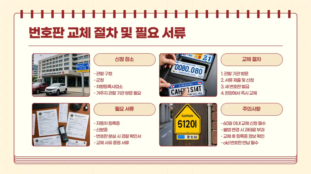 번호판 교체를 희망하는 경우, 다음과 같은 절차와 서류를 준비하여 관할 구청, 군청 또는 차량등록사업소를 방문해야 합니다.