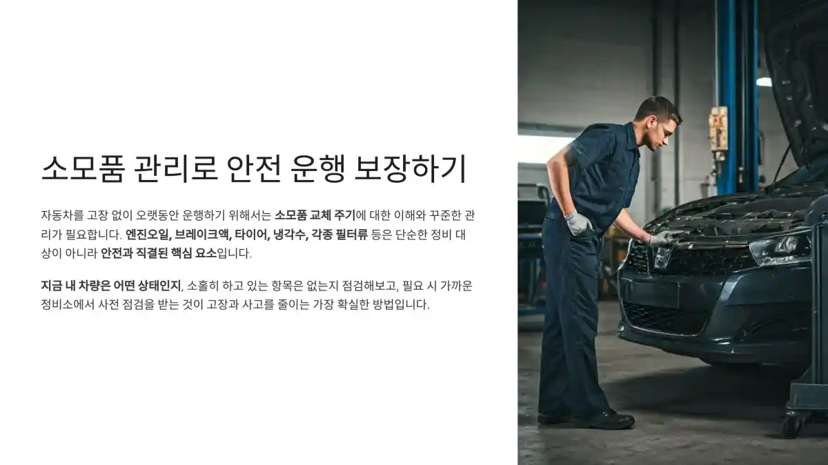 이 글에서는 자동차를 안전하게 오래 타기 위해 반드시 관리해야 할 소모품 교체 주기와 점검 기준을 항목별로 정리하였습니다.